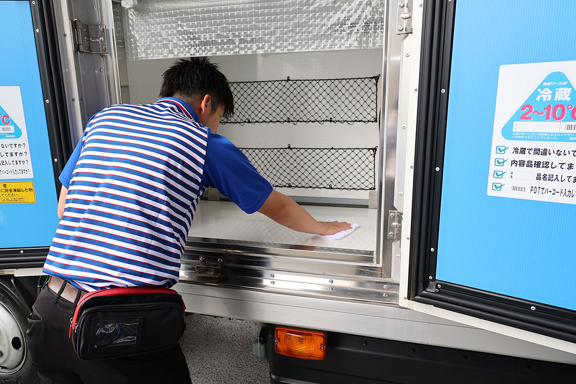 飛脚クール便は多くの食品を取り扱っているため、衛生管理が重要であり、車両の冷凍・冷蔵庫は毎日清掃を行っています。従業員の一人一人が「食の安全をしっかり守る」という気持ちで、車両の庫内や蓄冷剤の清掃を徹底し、常に衛生的な環境の維持に努めています。