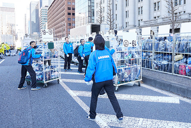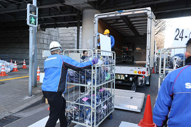 「手荷物を積んだ大型トラックがフィニッシュ地点周辺に到着。大手町から有楽町エリアにかけて計8カ所に大型トラックを配置させて、ランナーがフィニッシュする前にはカーゴを降ろし、手荷物をお渡しできる準備を終えます」
