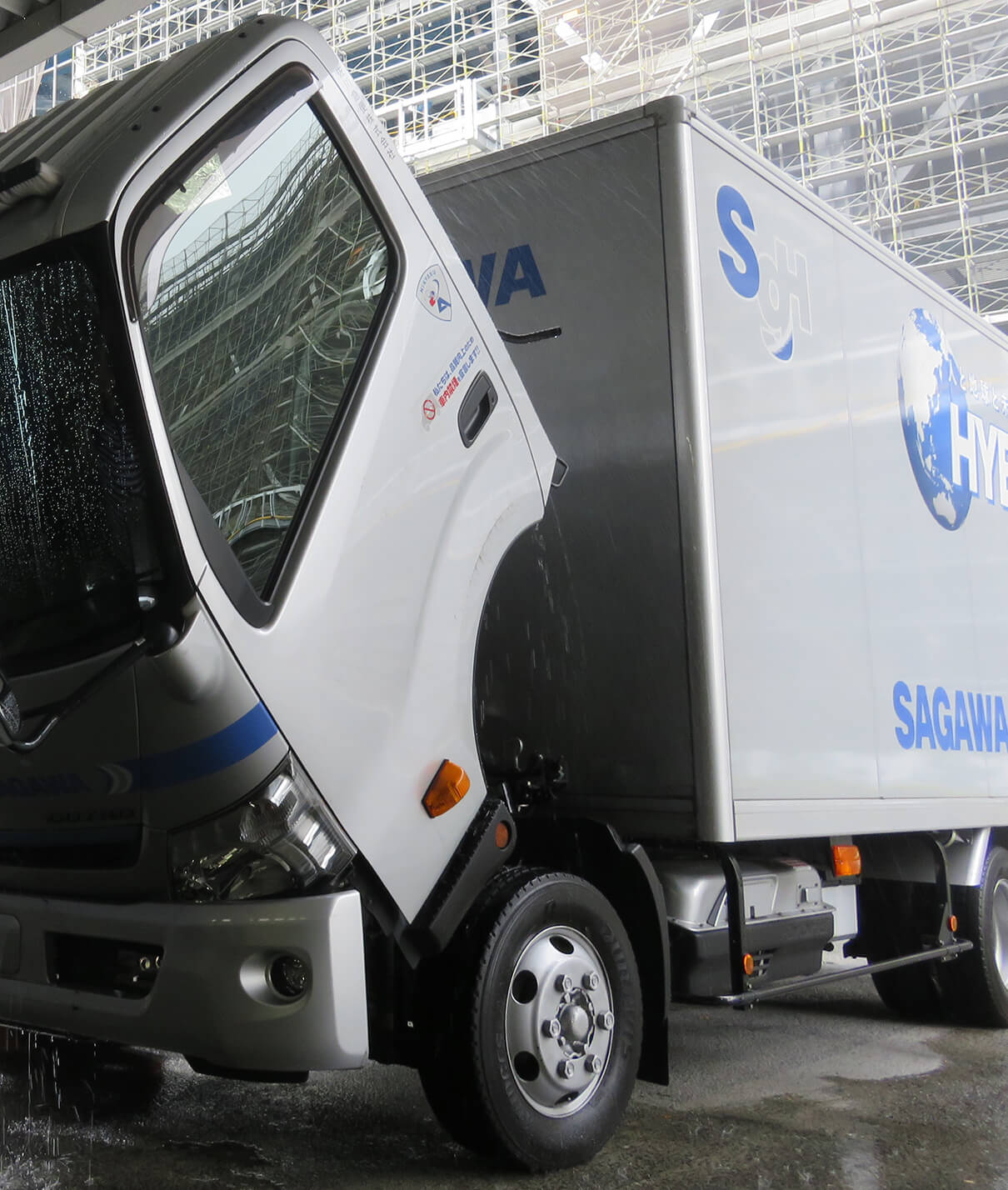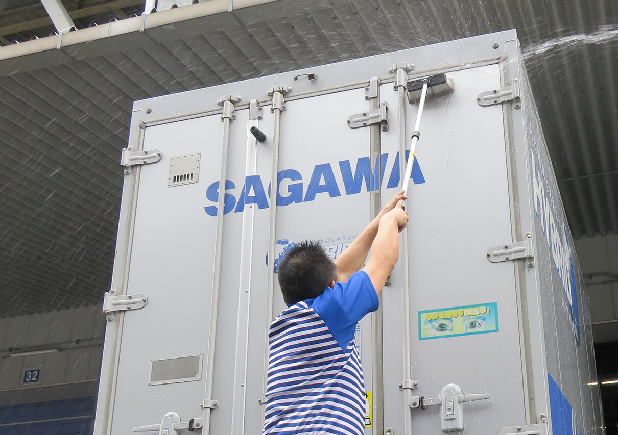 佐川急便では、トラックの洗車を定期的に行っています。ガラスやタイヤの外観磨き、荷台の掃き掃除だけではなく、目に届きにくい細部にまで手を伸ばします。