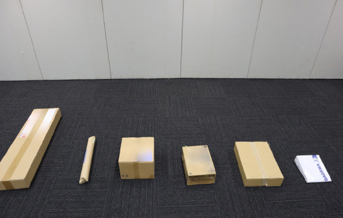 段ボールや筒状、封筒型など、さまざまな形状の荷物を前に、