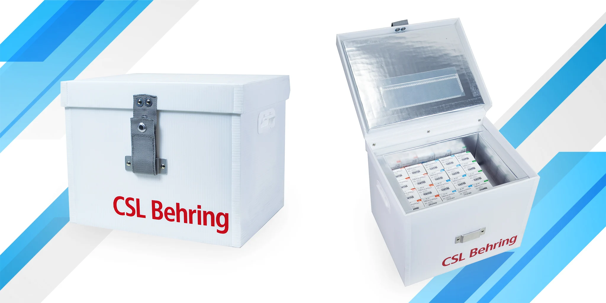 CSLベーリングさま開発の専用ボックスを使用し、事前に蓄冷剤を予冷するなどの調温作業を実施。貯法を遵守した温度帯での輸送を確立しました。