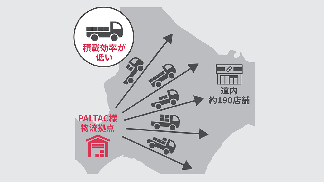 函館・旭川・帯広・釧路・北見の5エリアの佐川急便営業所等を中継デポとして活用し、PALTACさま拠点からの直送店舗数を160店舗から111店舗へ30%縮小し、長距離幹線はトレーラーで横持ち、釧路・北見といった遠方エリアでは、運行時間の短縮を図るため、トレーラーの「スイッチ運行」を設計しました。デポから店舗へは中型・大型車によるピストン運用を行いました。さらに動態管理端末を導入し、リアルタイムの運行可視化と改善サイクルの構築を担いました。佐川急便の社員がPALTACさま拠点に駐在し、3社の連携窓口として継続的な改善を伴走しています。