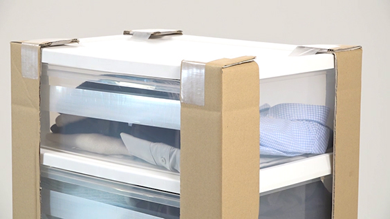 衣装ケースの梱包は、引き出しが飛び出さないようにテープでとめます。