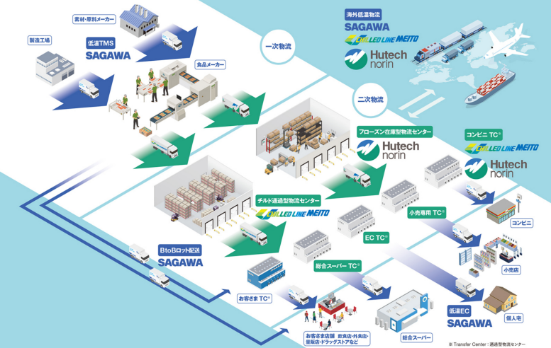 業界に先駆けて冷蔵・冷凍倉庫の自動化を推進してきた名糖運輸とヒューテッ クノオリンの最新鋭の低温物流施設や車両と、佐川急便の中継センターや路線 輸送を共同利用することで、三温度帯が融合したシームレスな物流網を構築。コ スト・効率の両面で、これまで以上にフレキシブルなサービスをご提供します。