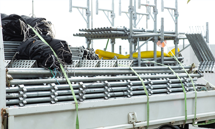 建材・仮設資材・足場などをサプライヤーから引き取り、門前倉庫※で一時保管のうえ、建設・製造現場の工程に合わせてJIT(ジャスト・イン・タイム)で搬入。大型船舶製造現場の輸送実績を活用します。