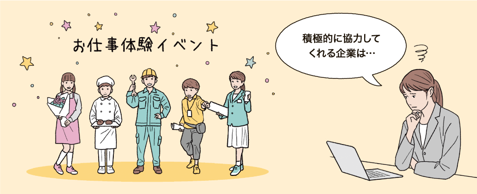 職業体験などのイベントの実施に当たり、出展してもらえる企業を探している