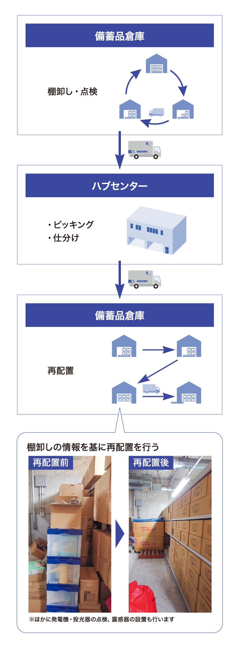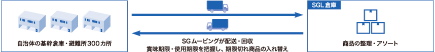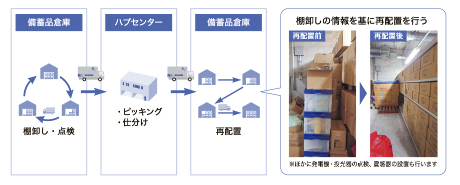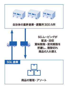 - 既存の備蓄品や新たに調達された物資を一度回収し、グループ会社の拠点に集約。