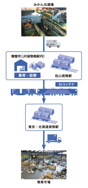 - JR貨物さまのコンテナを活用した輸送をご提案。佐川急便がみかんの共選場にて集荷を行い、貨物駅に持ち込むスキームを確立