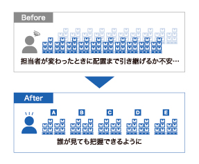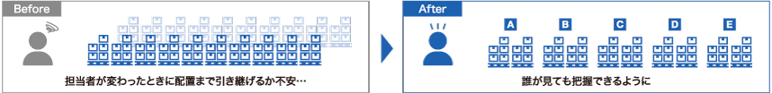 - 備蓄品の情報や配置が属人化しており、担当者の交代のたびに詳細な引き継ぎが必要となっていた。