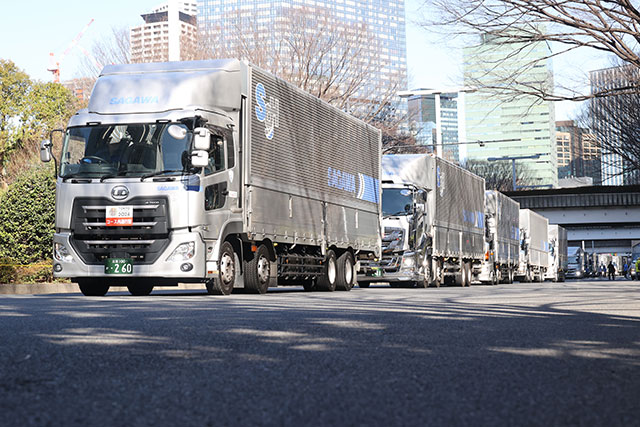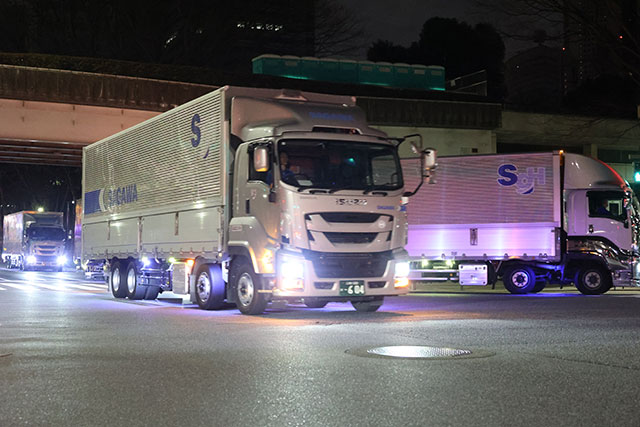「ランナーがスタートとしたのと同時刻の9時。大型トラック約40台が一列になってフィニッシュ地点に向けて発車します。この日のためにピカピカに磨き上げられたトラックが次々と発車していくシーンは、日頃トラックを見慣れた私たちから見ても壮観です」