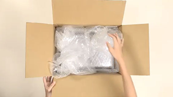 エアー緩衝材を底に敷き詰め、内容品が動かないように緩衝材で上下左右隙間を埋めてください。