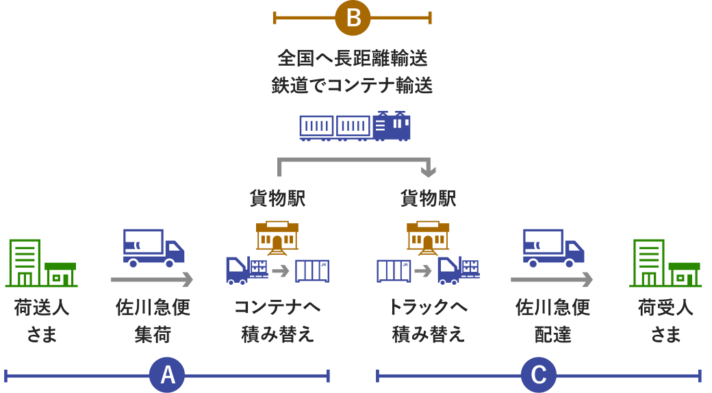 料金は、「A.集荷先~発駅(オフレール)」+「B.発駅~着駅(オンレール)」+「C.着駅~お届け先(オフレール)」の合算となります。