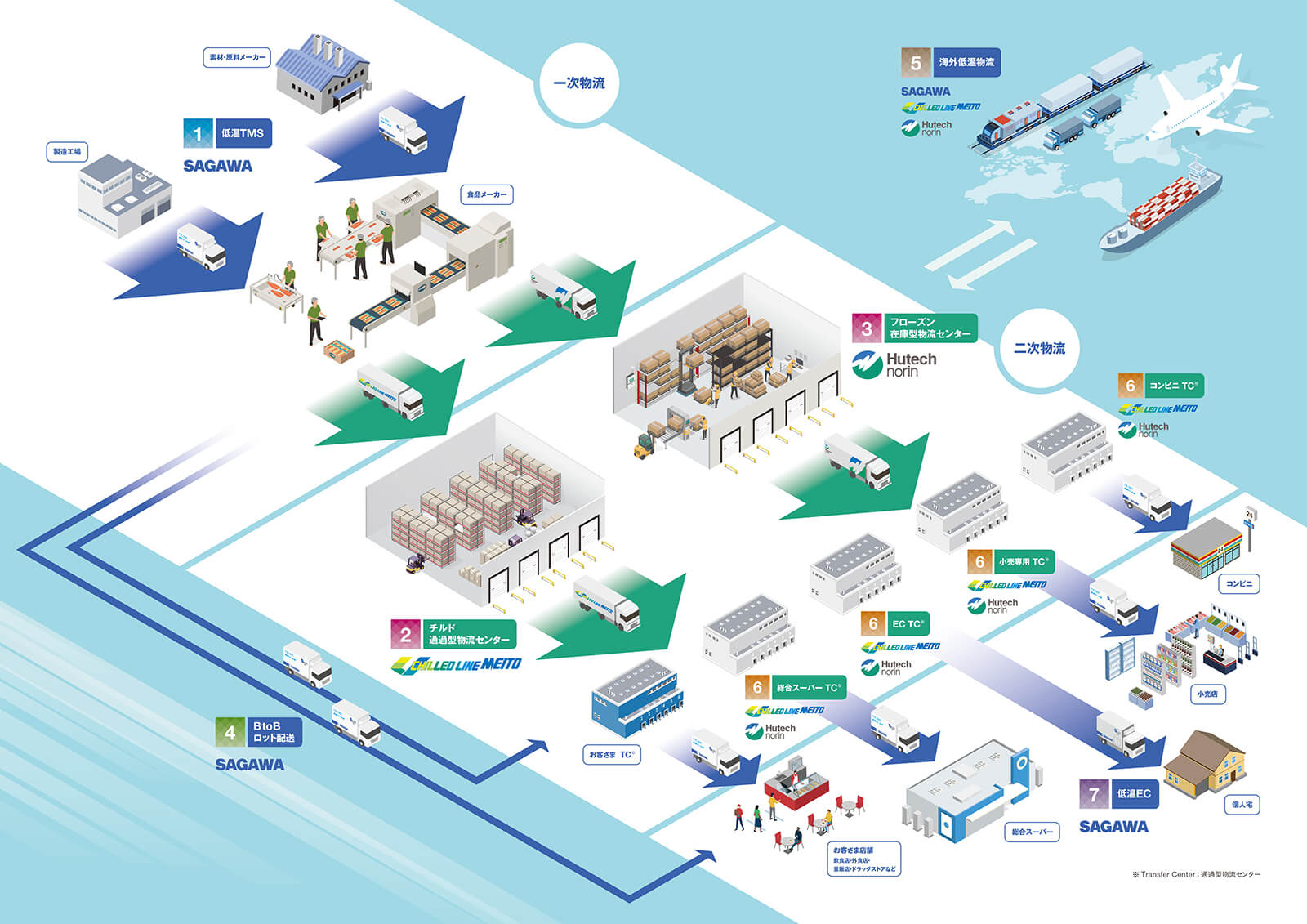 業界に先駆けて冷蔵・冷凍倉庫の自動化を推進してきた名糖運輸とヒューテックノオリンの最新鋭の低温物流施設や車両と、佐川急便の中継センターや路線輸送を共同利用することで、三温度帯が融合したシームレスな物流網を構築。コスト・効率の両面で、これまで以上にフレキシブルなサービスをご提供します。