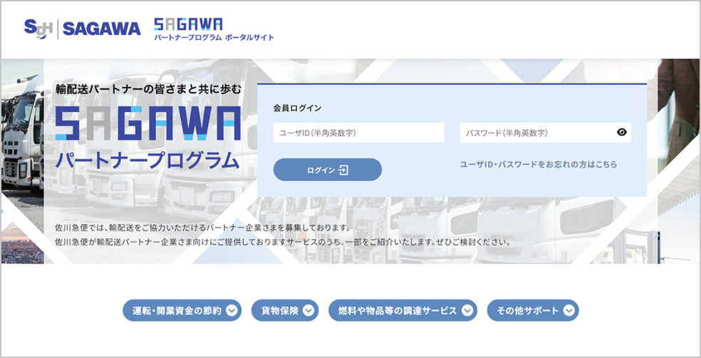 SAGAWAパートナープログラムは、パートナー企業の皆さまのビジネスをバックアップする、SGホールディングスグループのサポートプログラムです。佐川急便とグループ事業会社、提携会社が一体となり、車両の調達・貨物保険・税理士の紹介・ドライバーの確保などさまざまな領域で、オールインワンのサポートを行います。