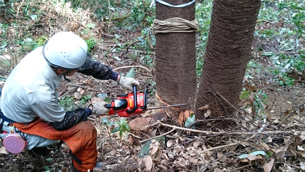 伐倒する方向に重心が傾いているため、切っているうちに裂け上がることがないようにロープで縛るなど策を講じてチェンソー作業を行います。