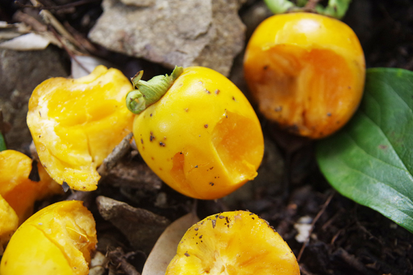 山を少し登ると、食べ散らかした柿の実が一面に転がっていました。