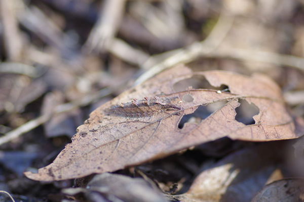 次はエノキの根元の落ち葉をめくってみると…頭に2本の角を持ったチョウの幼虫、オオムラサキです!エノキの葉を食べて育つ幼虫は、冬の間は落ち葉にヒシっとしがみつき、落ち葉の布団のなかで春を待っています。