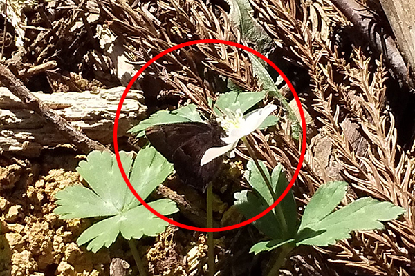 日に日に暖かくなる森の中。沢沿いの陽だまりが白く可憐なニリンソウの花に覆われていました。その景色に見とれていると、かわいい毛玉のようなビロードツリアブが飛んできました。花をよくみると、気温が低くて動けないのか花の上でクモがジッとしています。さらには、ムラサキシジミやハエ類などがひなたぼっこをしていました。パラボラのような形の花は、陽を集めるので周りよりも暖かいのだとか。虫たちにとってニリンソウは、コタツのような存在なのかもしれません。