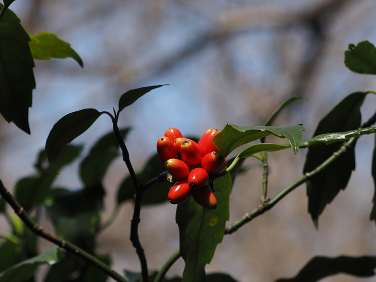 熟すとヒヨドリに食べられてしまうアオキの実だが、種子は丸のみされて運ばれ、フンとなって他の場所に落とす。ふと周りを見渡してみると、この森はアオキが多い。この高尾100の森で暮らすヒヨドリたちの食欲が、ここまでアオキを拡げたのかもしれない。